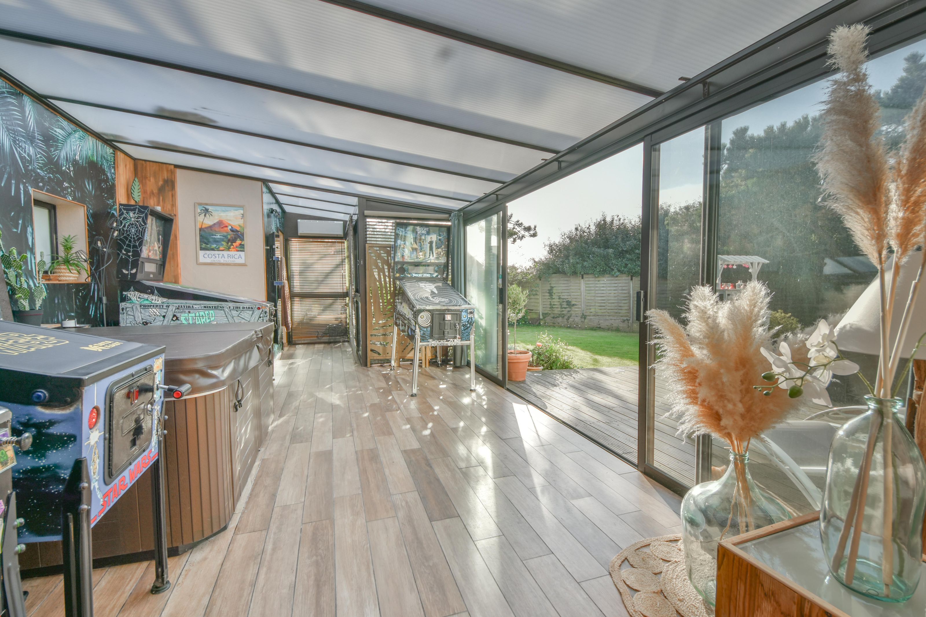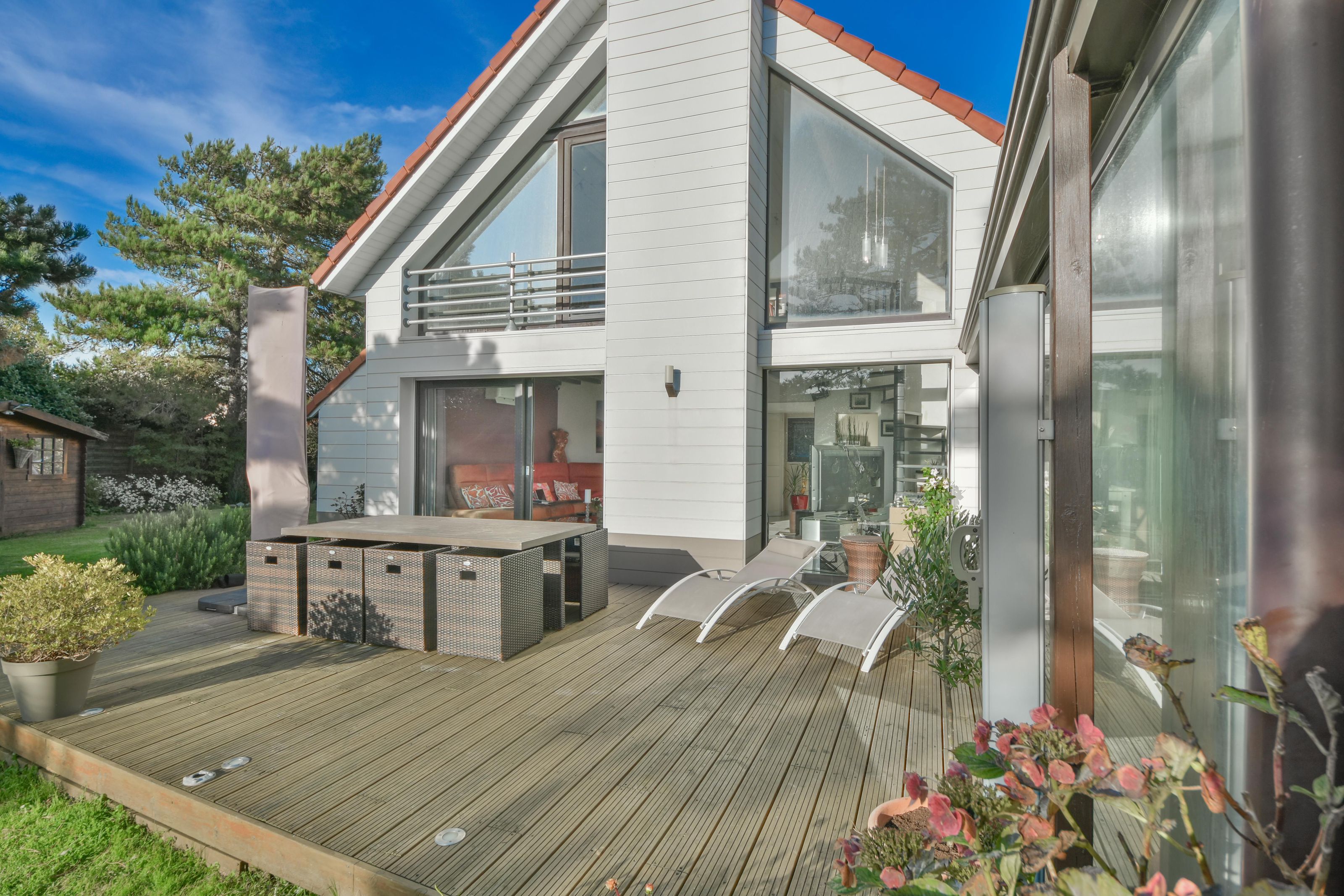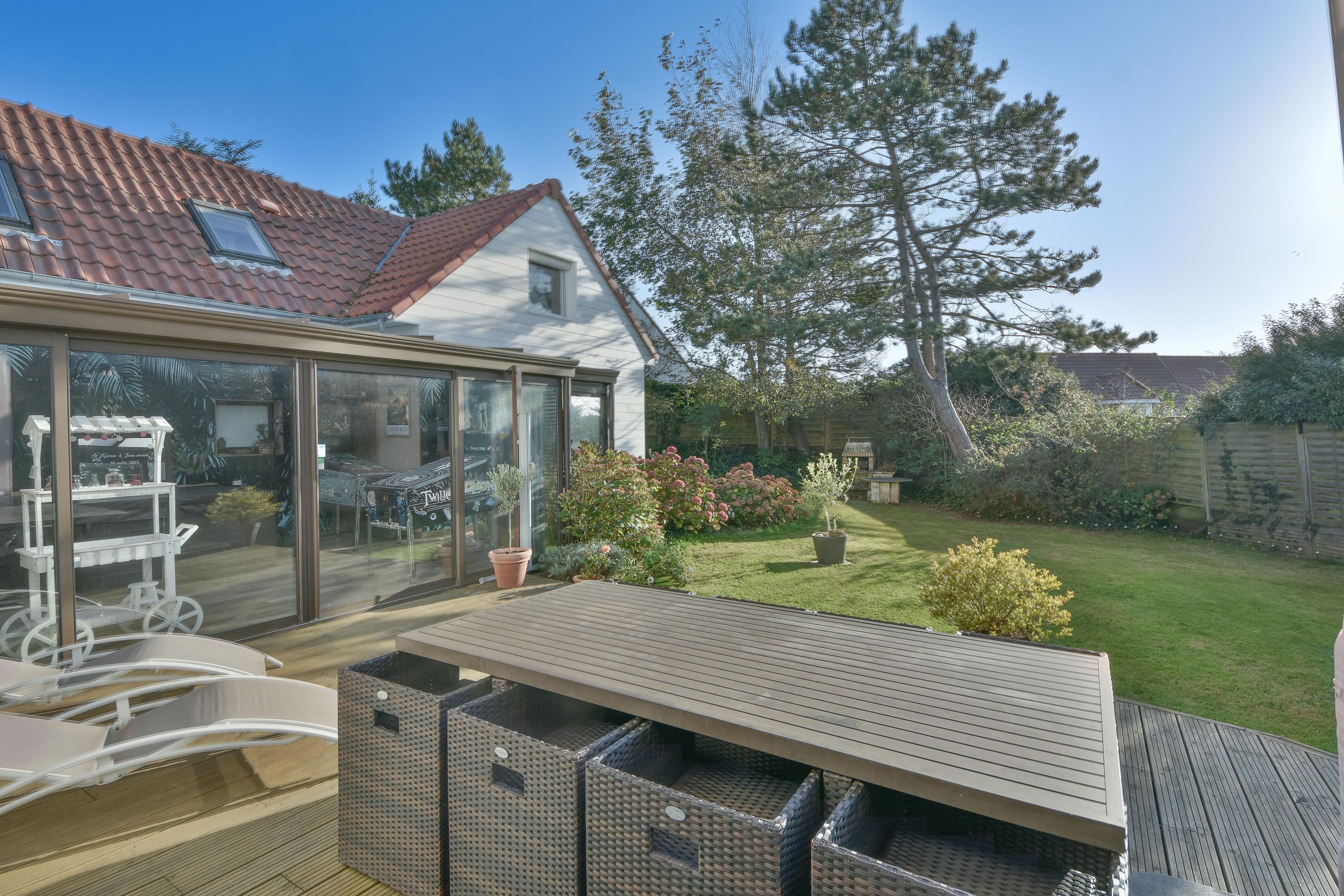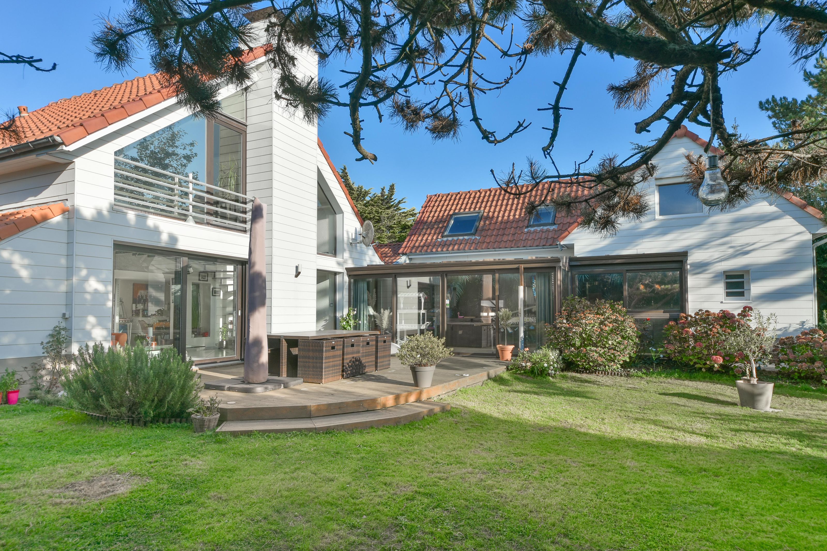 VILLA 4/5 CHAMBRES – VERANDA – EXPOSITION SUD-OUEST sur 996 m² DE TERRAIN Située dans un environnement calme et recherché, à proximité de la plage et du centre d’Hardelot, cette villa familiale de 153m2 séduit par son emplacement privilégié, sa luminosité et son excellent état d’entretien. Elle se compose au rez-de-chaussée d’un hall d’entrée ouvrant sur un séjour avec cheminée insert et accès à la terrasse exposée Sud-Ouest, d’une salle à manger, d’une cuisine aménagée et équipée, ainsi que d’un WC indépendant. À l’étage, une mezzanine détente offre une petite vue mer, desservant une chambre d’enfant (actuel dressing), une seconde chambre et une salle de douches. Une aile secondaire attenante, reliée par une grande véranda lumineuse donnant sur la terrasse, comprend une chambre de plain-pied avec cabinet de toilette et accès à une seconde terrasse, un WC, et à l’étage, un dégagement menant à deux chambres supplémentaires et une salle de bains. Un garage une voiture avec espace buanderie, une cave à vin et un chalet de jardin complètent ce bien. Le magnifique jardin paysager, soigneusement entretenu et équipé d’un robot tondeuse, bénéficie d’une exposition Sud-Ouest idéale et de deux grandes terrasses, parfaites pour profiter du calme et de la nature environnante. Chauffage par pompe à chaleur et convecteurs électriques. Tout-à-l’égout. Les coûts liés à l'utilisation de ce bien sont estimés entre 2726 € et 3688 € par an, en fonction de l'utilisation standard sur 5 usages (chauffage, eau chaude sanitaire, climatisation, éclairage, auxiliaires), avec les prix moyens des énergies indexés sur les années 2021, 2022 et 2023 (abonnements compris). Enfin, toutes les informations sur les risques auxquels ce bien est exposé sont disponibles sur le site www.georisque.gouv.fr